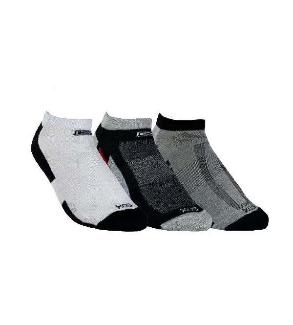 Tres pares del ART. DE334C. Puño doble elastizado, pie liso con banda elástica, empeine calado para mejorar la respirabilidad, costura de puntera extra plana, talón y puntera reforzados. Ajuste y calce perfectos gracias al agregado de spandex.